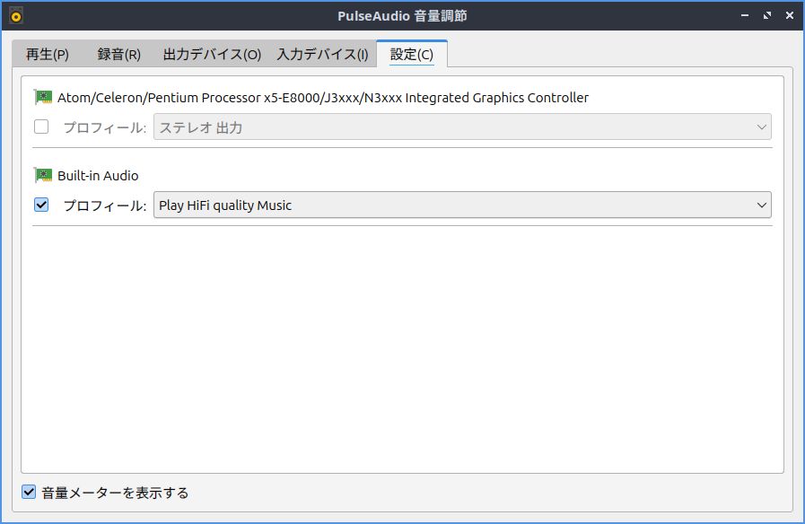 「設定」タブの、上の「Atom/Celeron/Pentium Processor x5-E8000/J3xxx/N3xxx integrated Graphics Controller」の「プロフィール」チェックボックスのチェックを外したら、急に音が出ました。